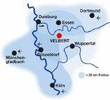 Velbert liegt zwischen den Großstädten Düsseldorf, Essen und Wuppertal. Ein "Klick" auf die Karte zeigt es genauer.